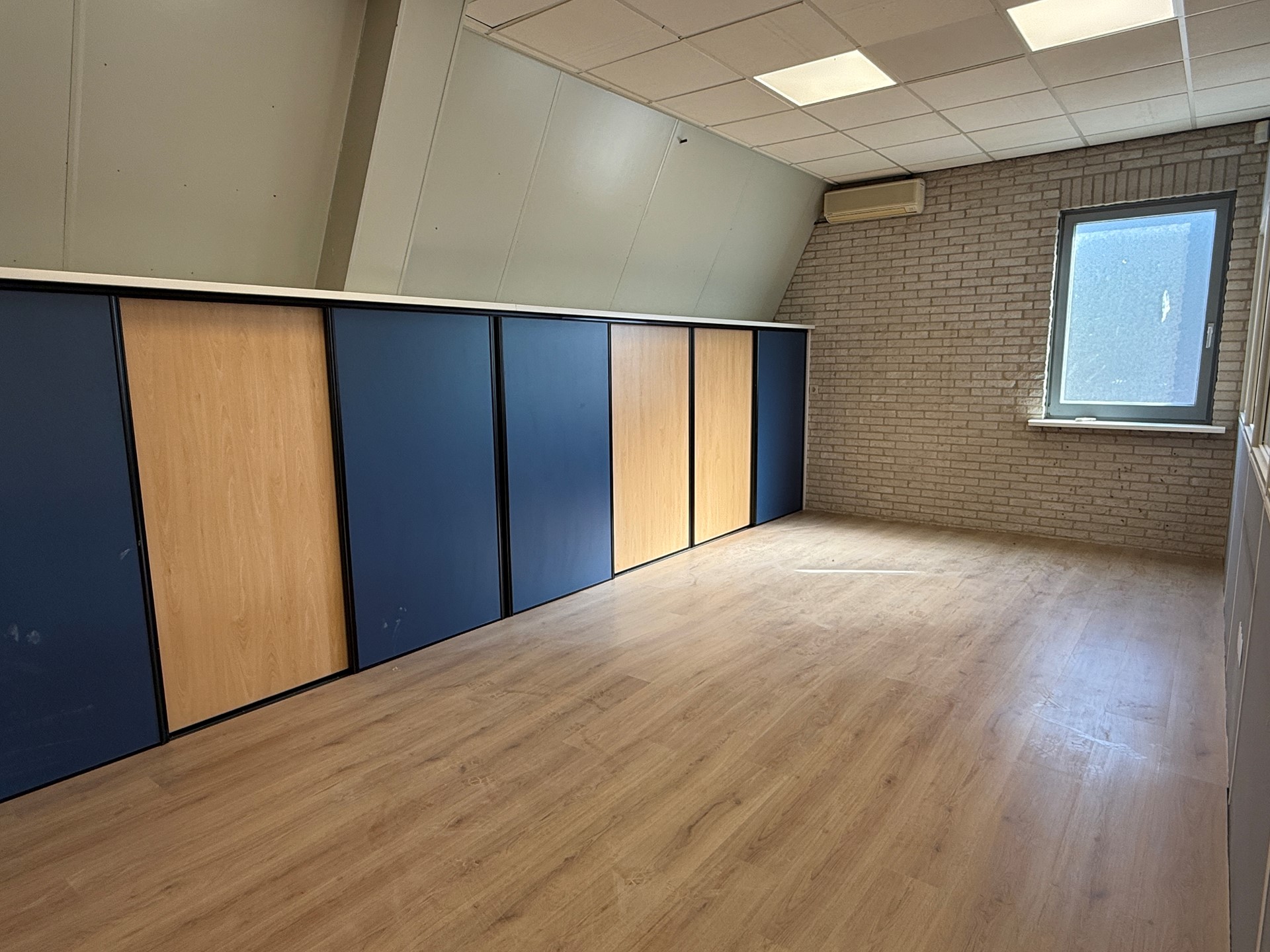 1ste verdieping: Kantoorruimte met systeemplafond voorzien van led inbouwverlichting, een PVC vloer en diverse vaste kasten.