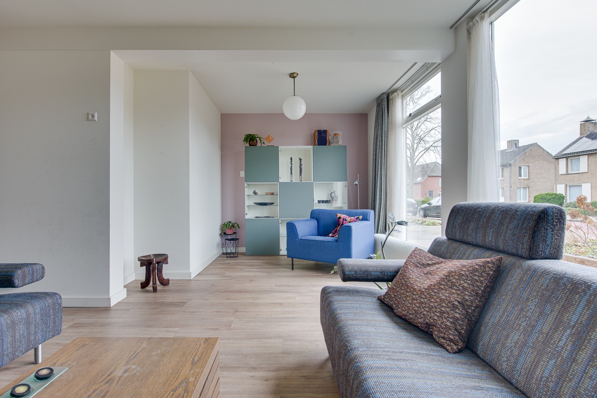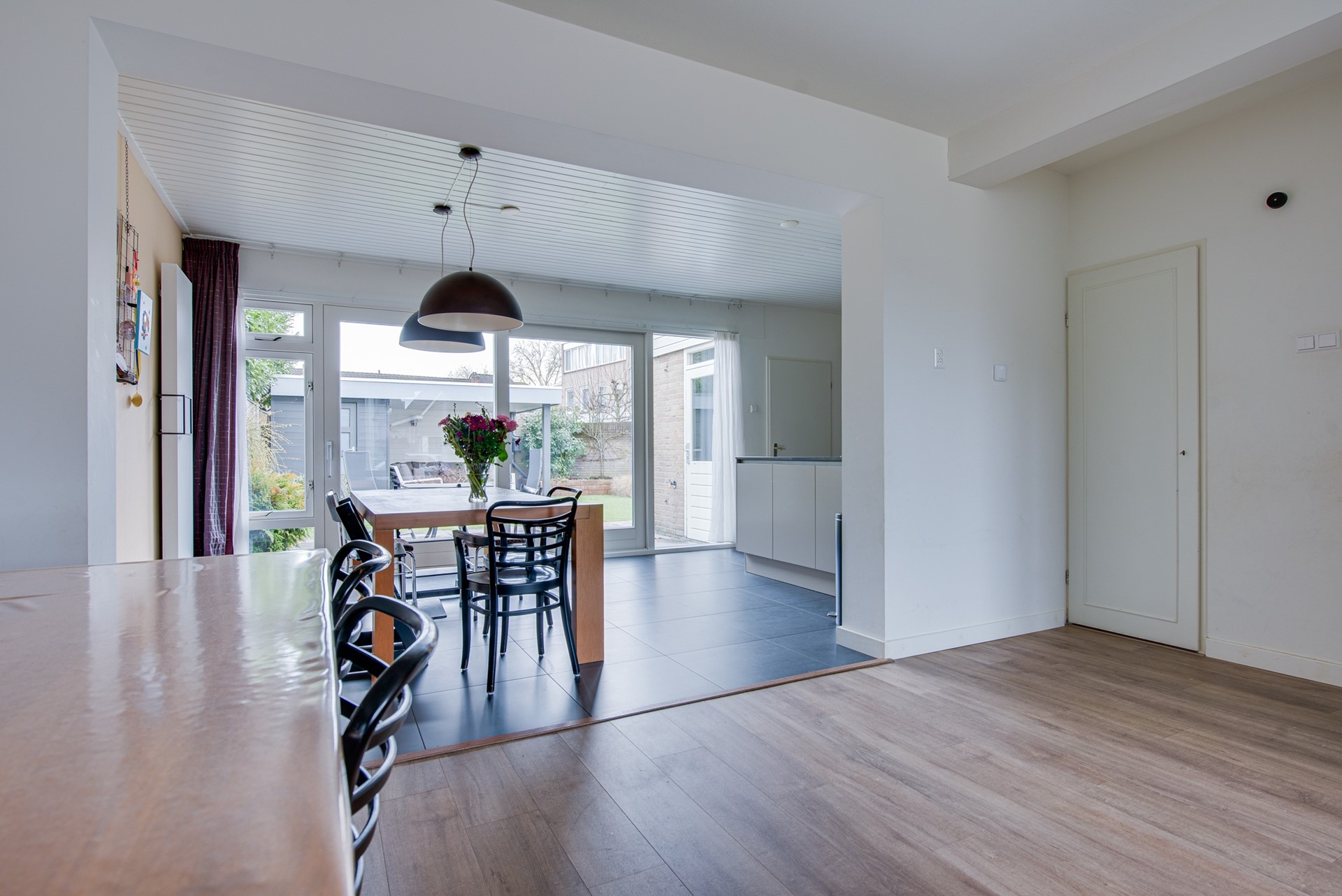 De royale L-vormige woonkamer is speels en functioneel ingedeeld, met een comfortabele zithoek aan de voorzijde en een ruim eetgedeelte aan de achterzijde. Dankzij de grote raampartijen die tot aan de grond doorlopen, profiteert deze ruimte van een overvloed aan daglicht en een fraai uitzicht op de achtertuin. De woonkamer is hoogwaardig afgewerkt met een laminaatvloer, strak gestucte wanden en moderne kozijnen met dubbele beglazing, wat zorgt voor een eigentijdse en luxe uitstraling.