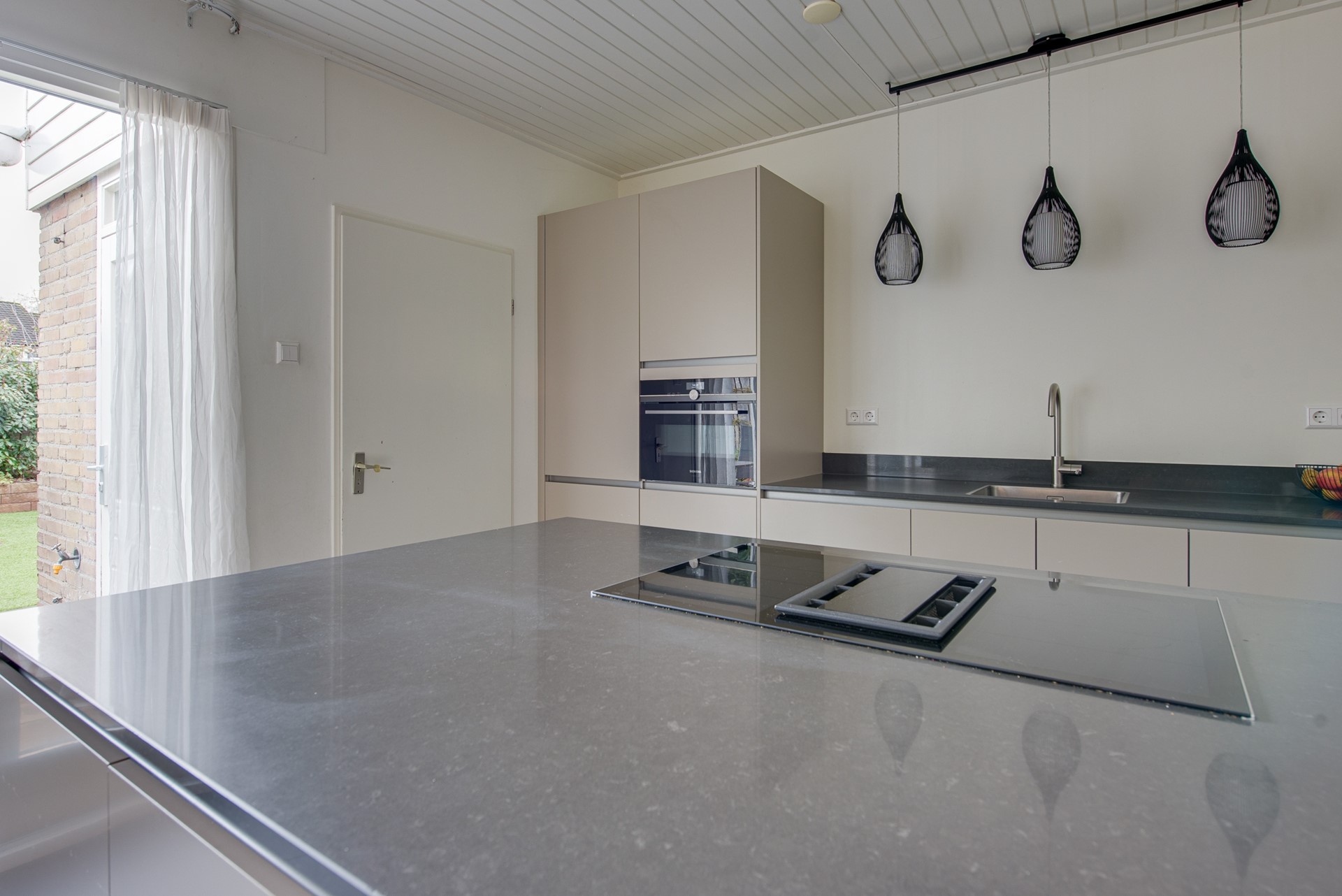Aan de achterzijde bevindt zich de open keuken, een echte blikvanger en het hart van de woning. De keuken is voorzien van een modern, greeploos keukenmeubel (2018) met volop bergruimte en hoogwaardige inbouwapparatuur, waaronder een grote koelkast, combimagnetron, vaatwasser en een inductiekookplaat met geïntegreerde afzuiging. Het stijlvolle schiereiland met composiet werkblad nodigt uit tot gezellig koken en samenzijn. De antracietkleurige vloertegels zijn uitgerust met vloerverwarming, wat bijdraagt aan extra comfort. Via de schuifpui heb je directe toegang tot het terras en de achtertuin, waardoor binnen en buiten naadloos in elkaar overlopen.