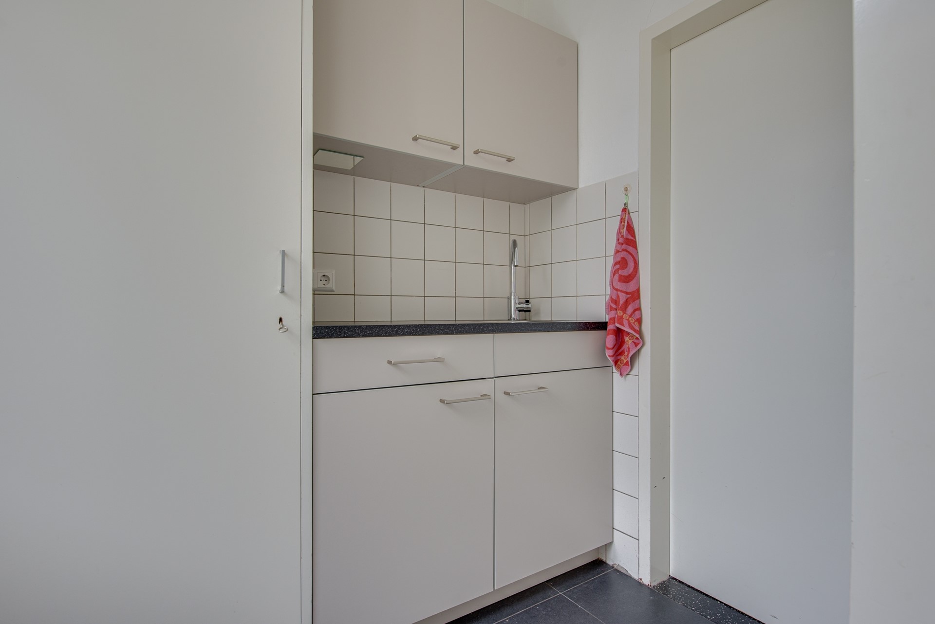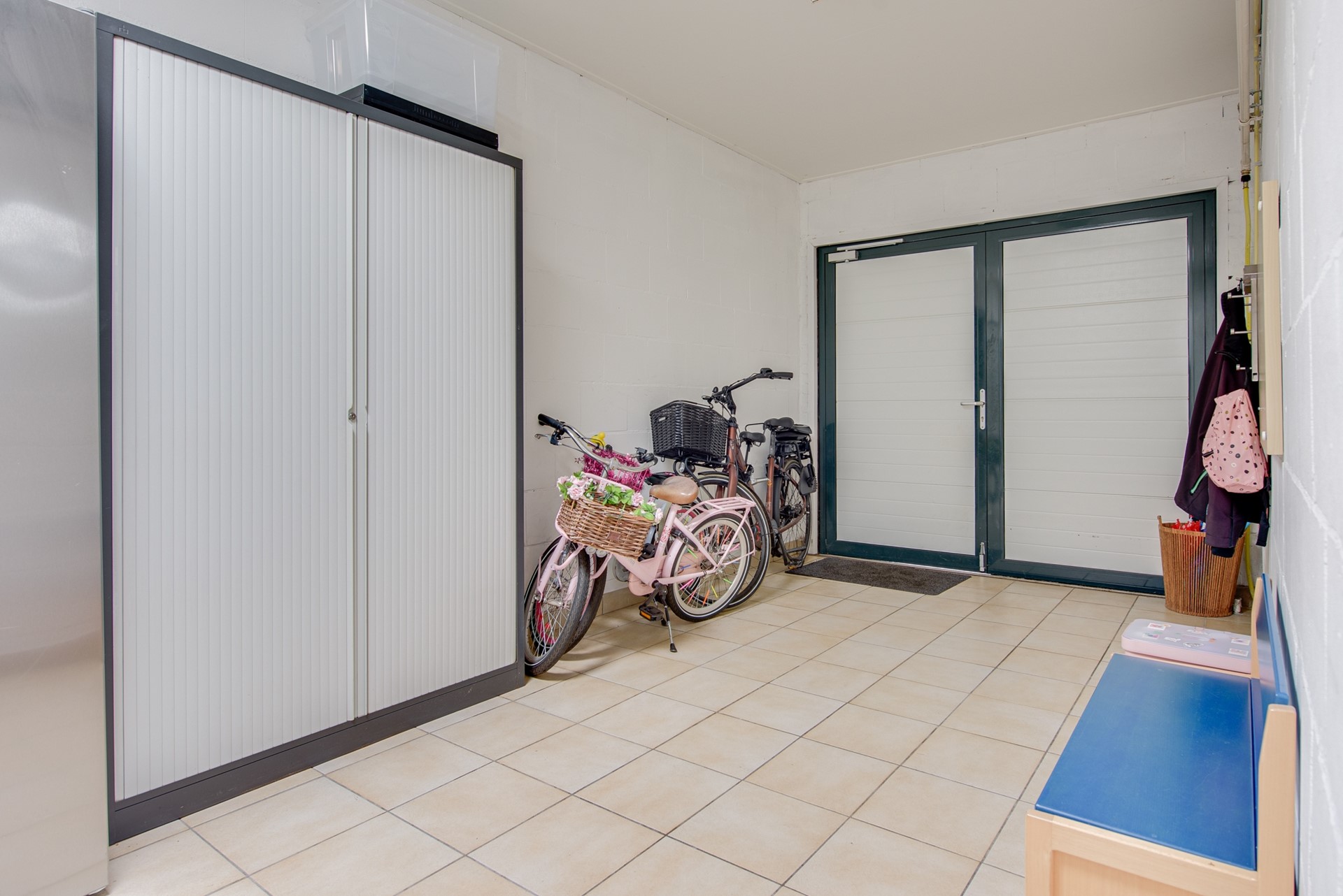 Via de praktische bijkeuken, voorzien van een klein keukenmeubel, bereik je de garage. Deze multifunctionele ruimte beschikt over witgoedaansluitingen en de cv-installatie (Intergas, 2024). De garage is afgewerkt met een tegelvloer en voorzien van twee openslaande, geïsoleerde deuren naar de oprit, wat zorgt voor optimaal gebruiksgemak.
