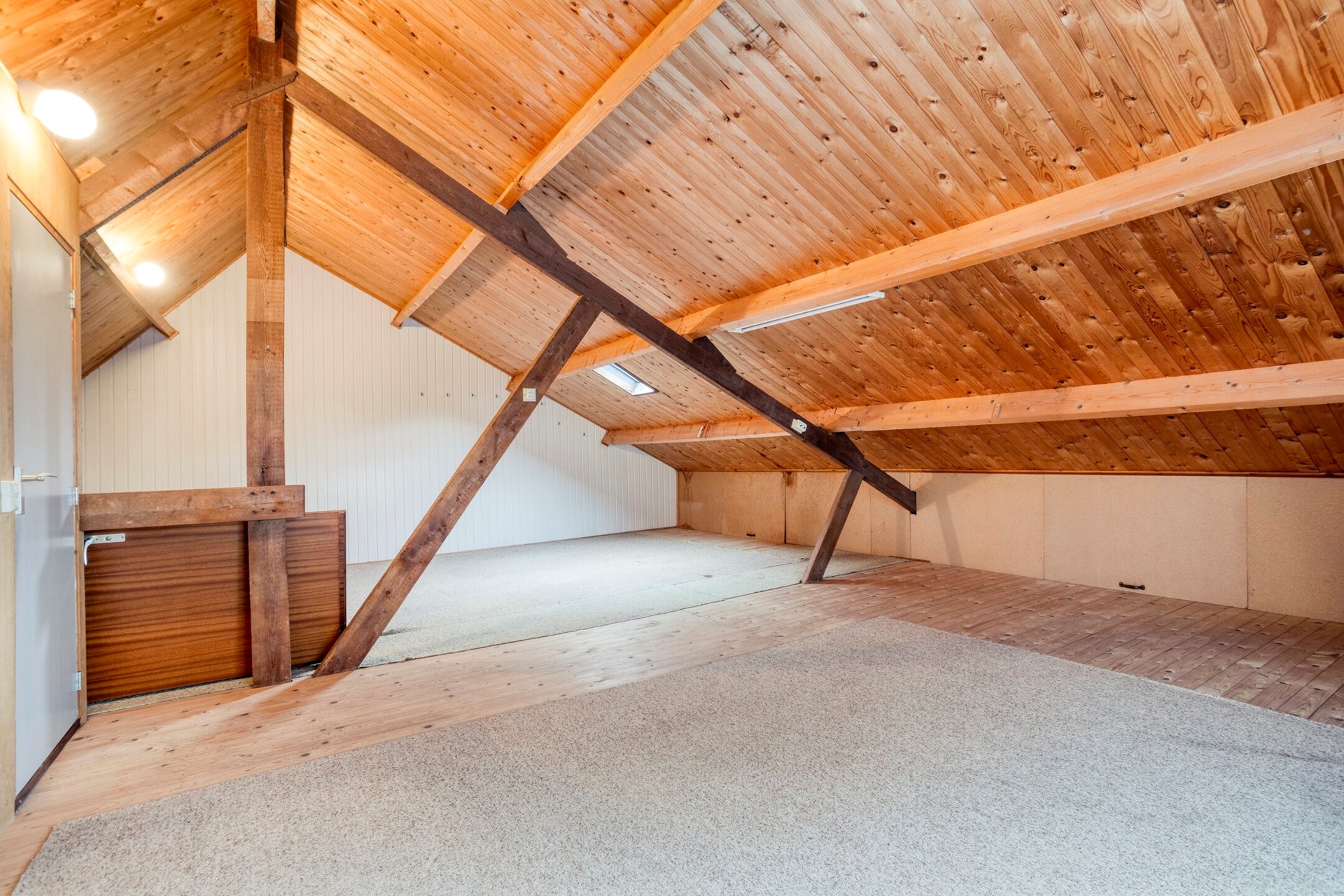 Op de 1e verdieping treffen we naast een kleine overloop een grote open zolderruimte aan, waar nu eigenlijk alleen de cv-combiketel (Intergas, 2007) opgesteld staat. Deze ruimte (ruim 65m², waarvan zo’n 38m² boven de 1,50m¹) biedt legio mogelijkheden. Zo zou er een hobby-/werkruimte met slaapkamer gerealiseerd kunnen worden of bijvoorbeeld twee (slaap)kamers met een badkamer.
