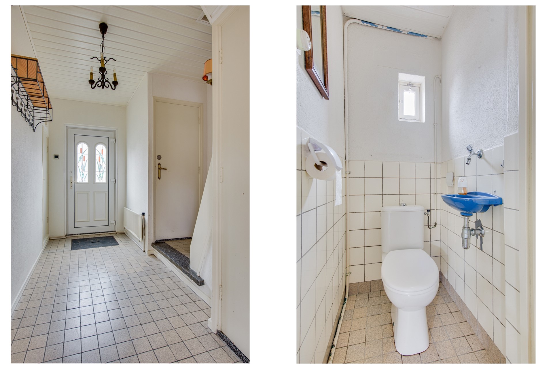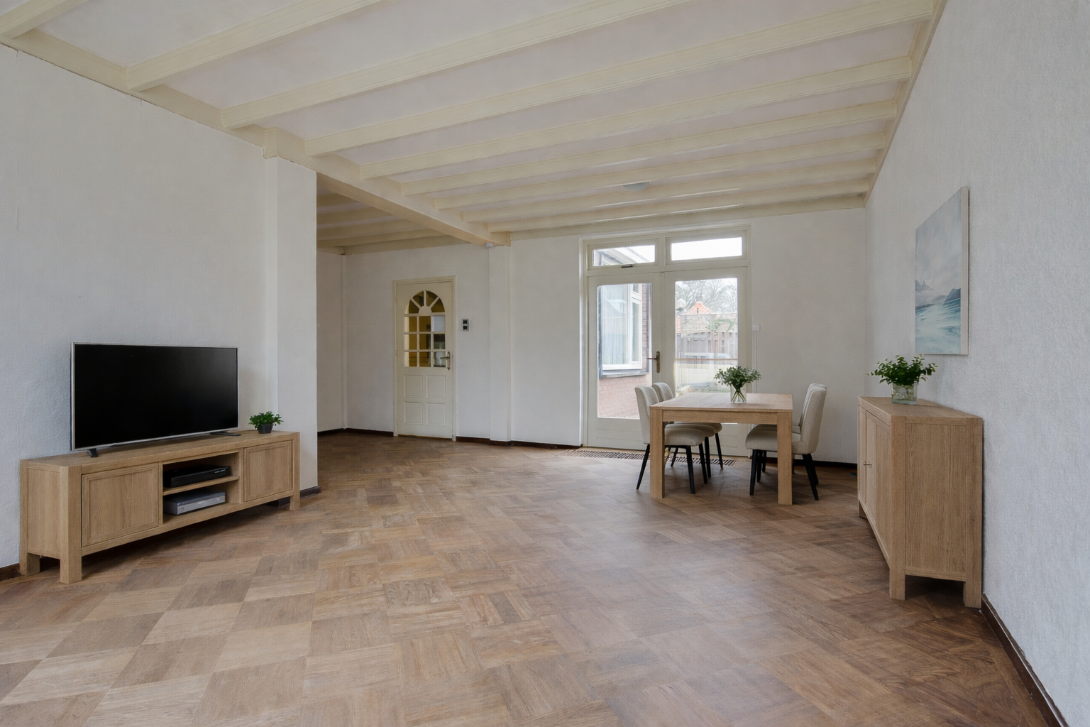 De woning wordt via een verhard pad in de keurig aangelegde voortuin betreden via de hal, waar zich de meterkast, de toiletruimte (met staand toilet en fonteintje), de trapkast en trapopgang bevinden. De hal is afgewerkt met een nostalgische tegelvloer, granol wanden en kunststof schrootjesplafond. Vanuit de hal komt men in de van oorsprong doorzon woonkamer, die nu echter een L-vorm heeft. Dit komt doordat de keuken in het verleden naar de uitbouw is verplaatst en de locatie waar oorspronkelijk de keuken stond bij de woonkamer getrokken is. De woonkamer is afgewerkt met een fraaie parketvloer, granol wanden en licht balkenplafond. De oppervlakte bedraagt zo’n 32m² en is nog vrij indeelbaar, want het zit- en eetgedeelte kan zowel aan de straat- als tuinzijde gesitueerd worden. Aansluitend aan de woonkamer treffen we de gesloten keuken, die met een oppervlakte van circa 11,5m² lekker ruim van opzet is en waar gemakkelijk een eettafel geplaatst kan worden. Het aanwezige authentieke, degelijke keukenblok is voorzien van enkele keukenapparatuur zoals een gaskookplaat, afzuigkap, oven, dubbele spoelbak, koelkast en vriezer. De keuken is afgewerkt met een tegelvloer, schoon metstelwerk/betegelde wanden en licht balkenplafond. De bijkeuken sluit weer aan op de keuken, waar de geiser, de witgoedaansluitingen en uitstort opgesteld staan. Via een loopdeur is vanuit de bijkeuken de achtertuin bereikbaar.