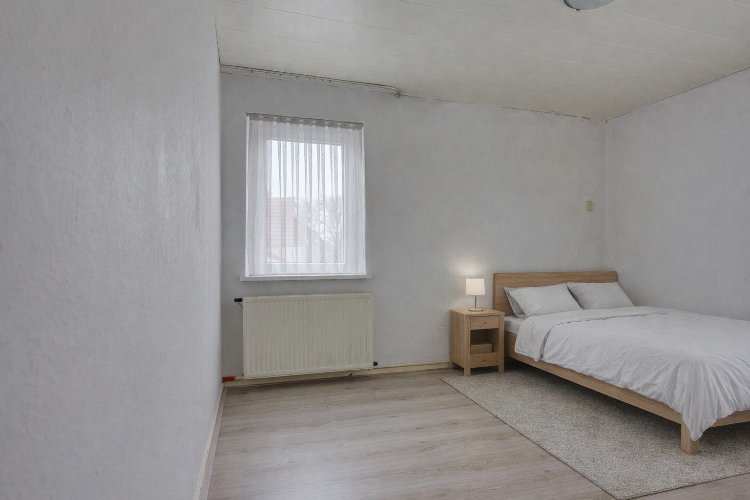 Op de 1e verdieping bevinden zich naast de overloop maar liefst vier slaapkamers en een badkamer/doucheruimte. De slaapkamers hebben een oppervlakte van respectievelijk circa 12m², 10m², 7,5m² en 6m² en zijn afgewerkt met een laminaatvloer of vloerbedekking, behangen wanden en kunststof schrootjesplafond. De eenvoudige, deels betegelde badkamer/doucheruimte is ingericht met een inloopdouche en vaste wastafel. Een raamkozijn zorgt er voor daglichttoetreding.