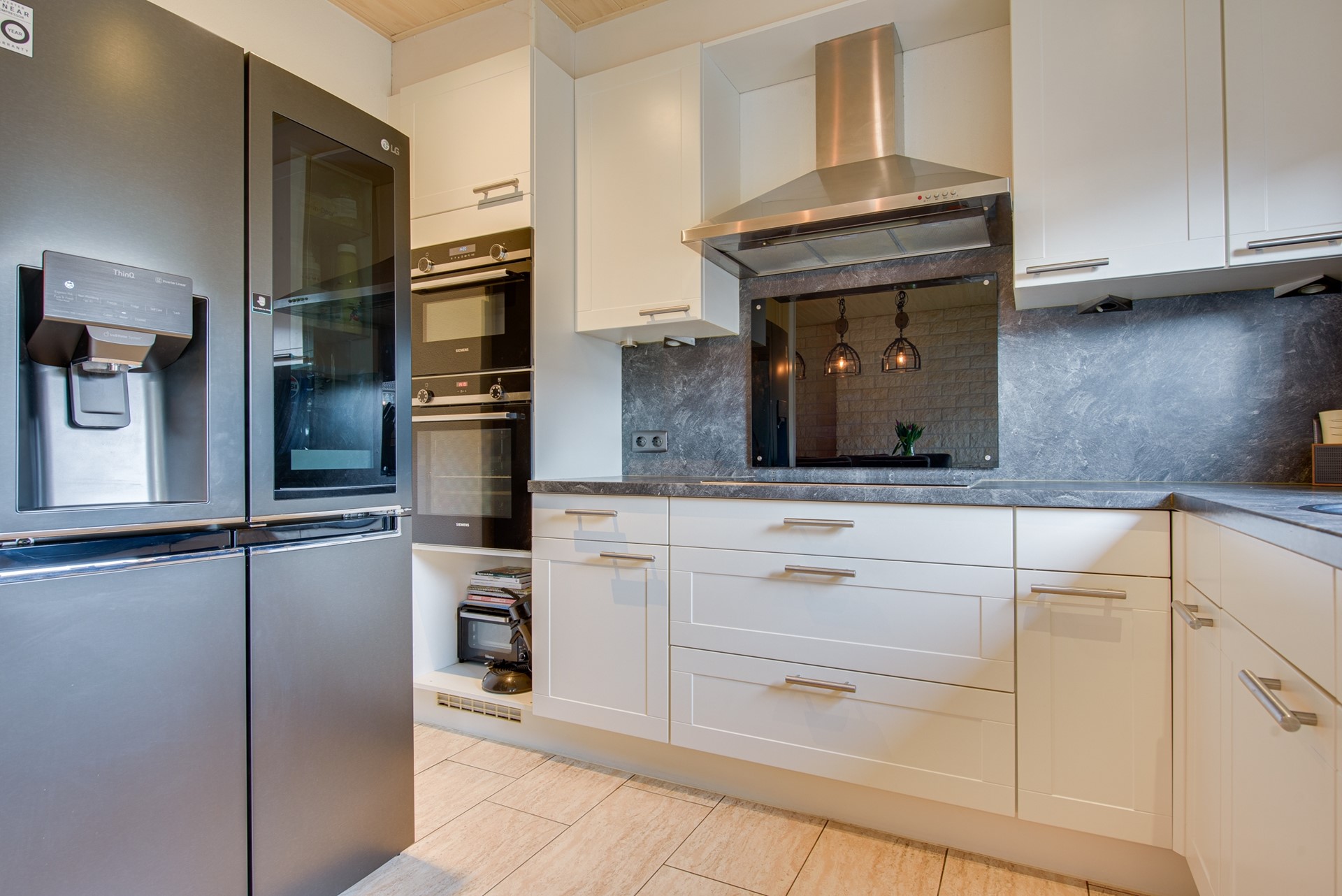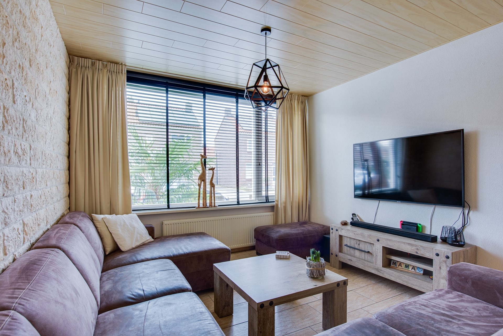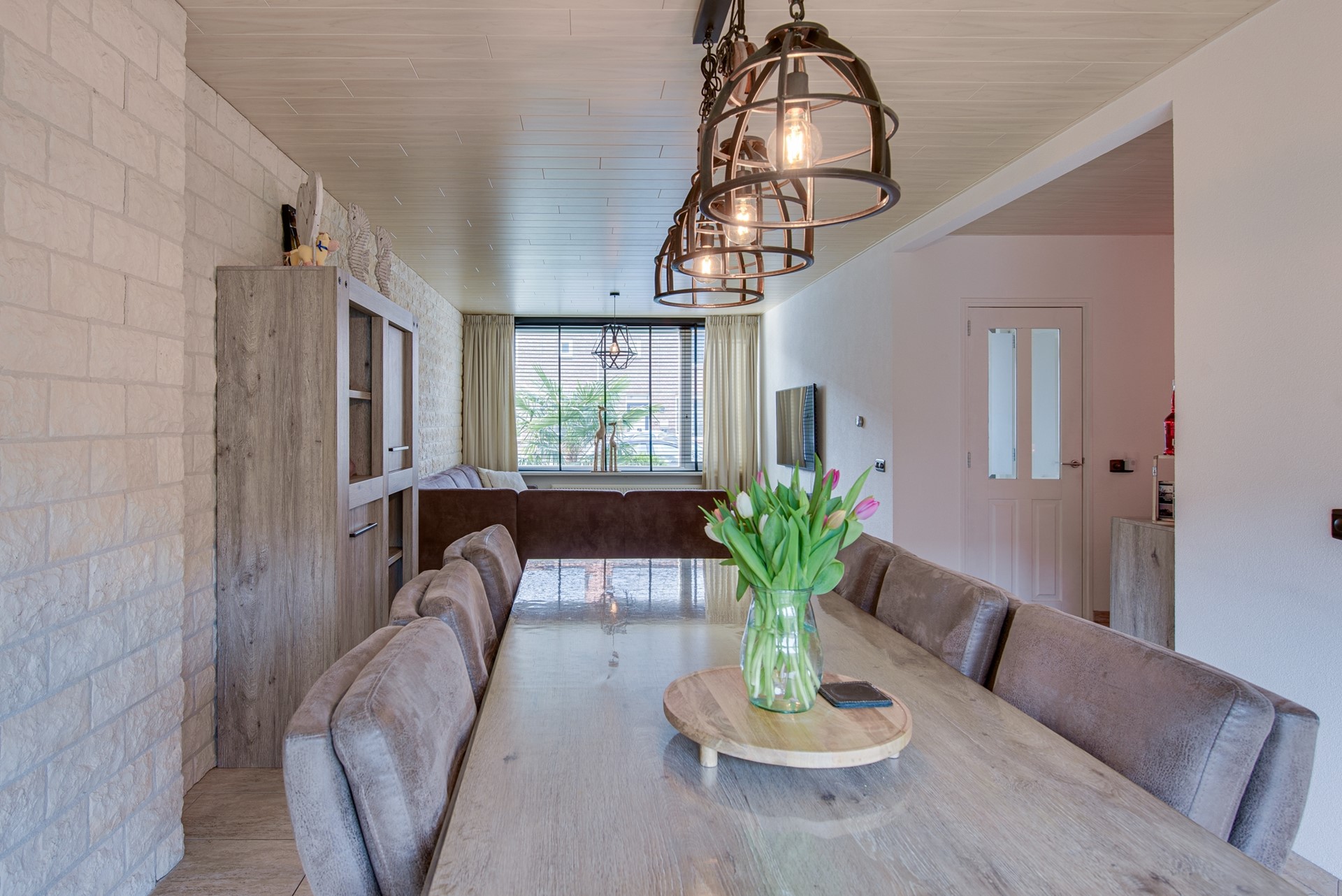 De royale L-vormige woonkamer biedt een speelse en functionele indeling. Aan de voorzijde bevindt zich een comfortabele zithoek, terwijl aan de achterzijde volop ruimte is voor een grote eettafel. Grote raampartijen zorgen voor een overvloed aan daglicht en bieden een mooi zicht op de achtertuin. De hoogwaardige afwerking, met een fraaie tegelvloer voorzien van vloerverwarming, stoere steenstrips wanden en moderne kozijnen met dubbele beglazing, geeft de woonkamer een luxe en eigentijdse uitstraling.