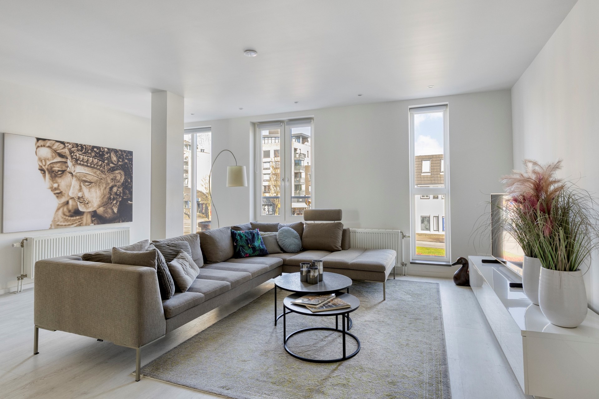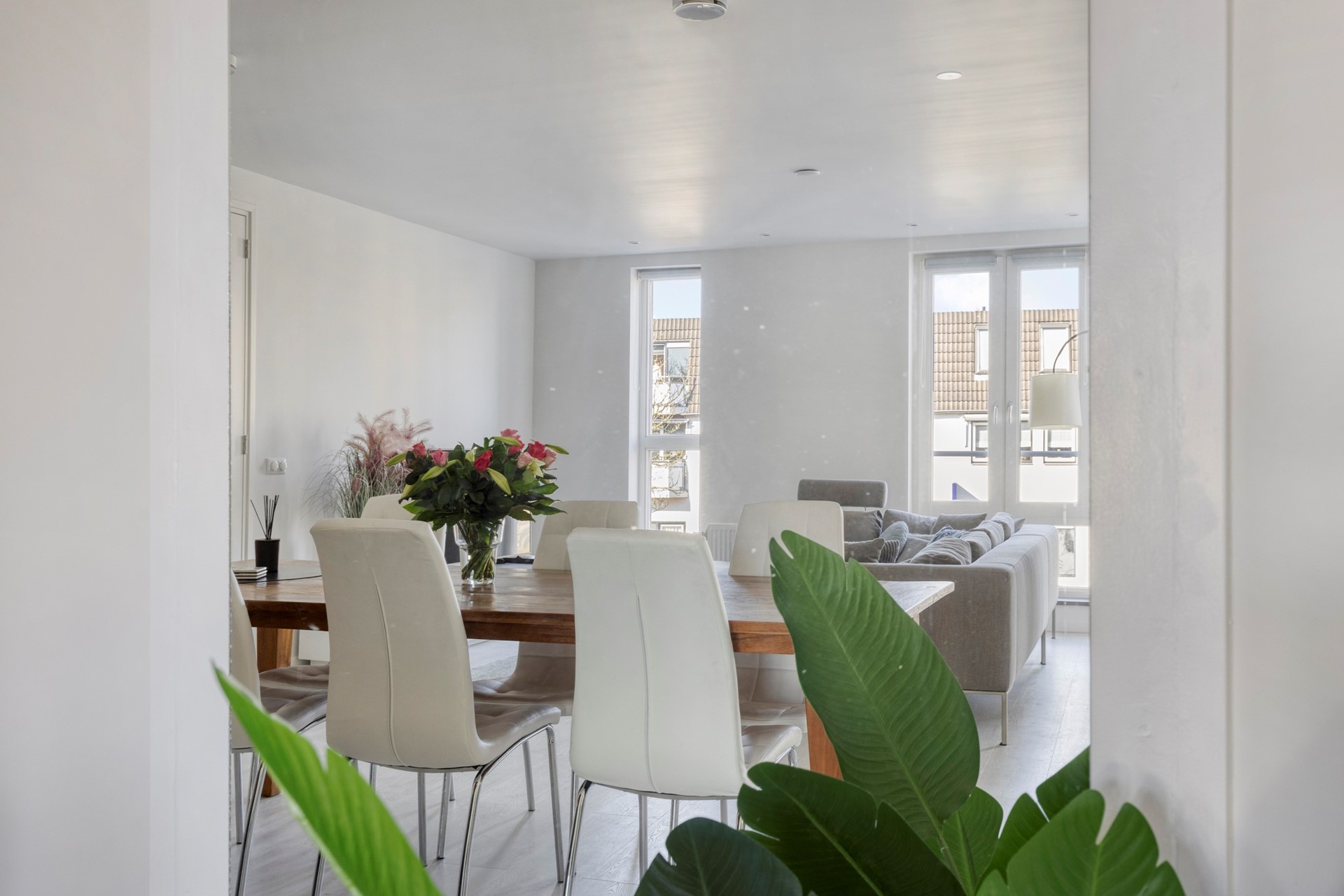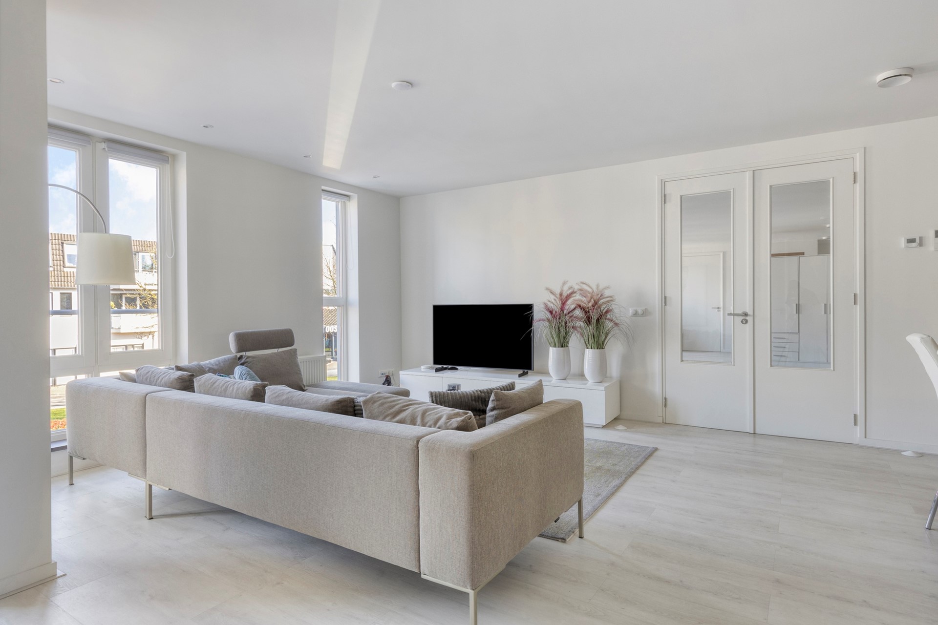 Het appartementengebouw wordt betreden via de keurige centrale entree/hal met intercom, waar zich o.a. ook de meterkasten, bergingen en trapopgang naar de drie bovenliggende verdiepingen bevinden. Aangekomen op de overloop van de 1e verdieping treffen we achter de voordeur van het appartement direct de heerlijk ruime, lichte woonkamer/living (ca. 44m²) met een comfortabele zithoek en een grote eethoek met een grote 6-persoons eettafel. Daarnaast is er nog een praktische trapkast aanwezig. Het gehele appartement is kwalitatief uitstekend afgewerkt met een lichte PVC laminaatvloer, licht gestucte wanden en strak gestucte plafonds met overal inbouwspots. De aanwezige raampartijen zorgen voor een prettige lichtinval. Een drietal van deze ramen is uitgevoerd als dubbele openslaande ramen welke zorgen voor extra aangename verblijfsruimten!