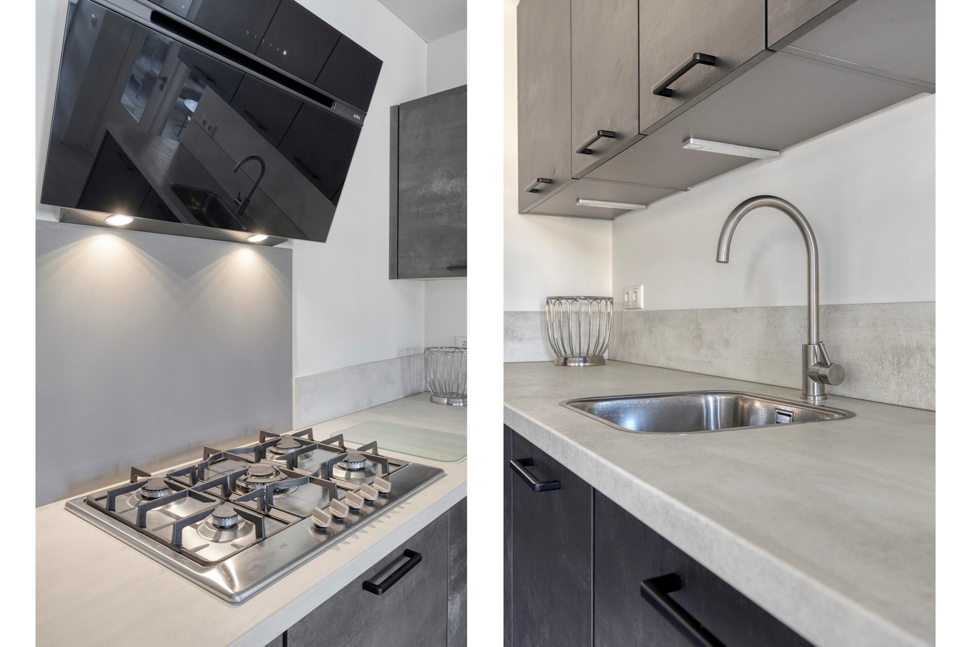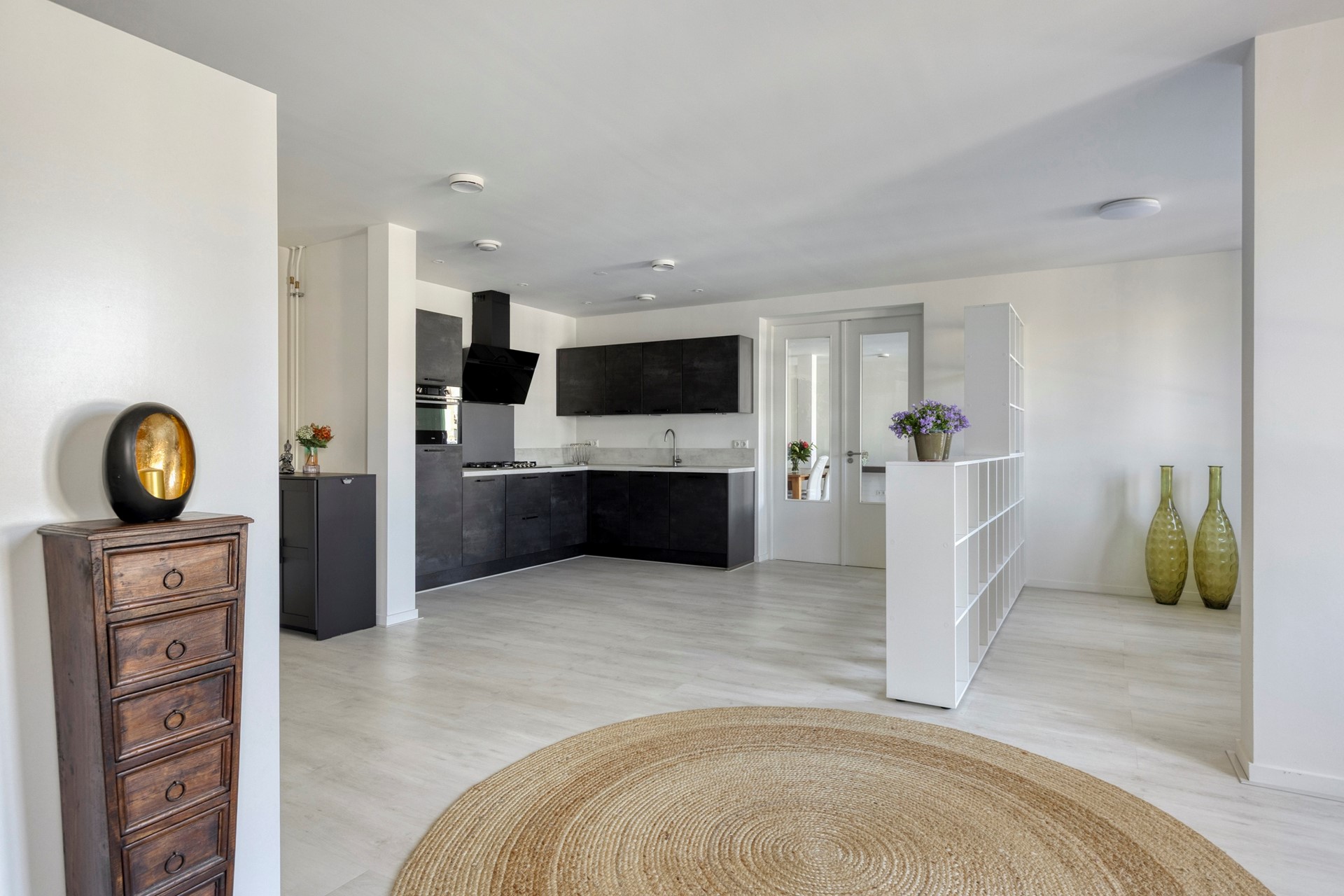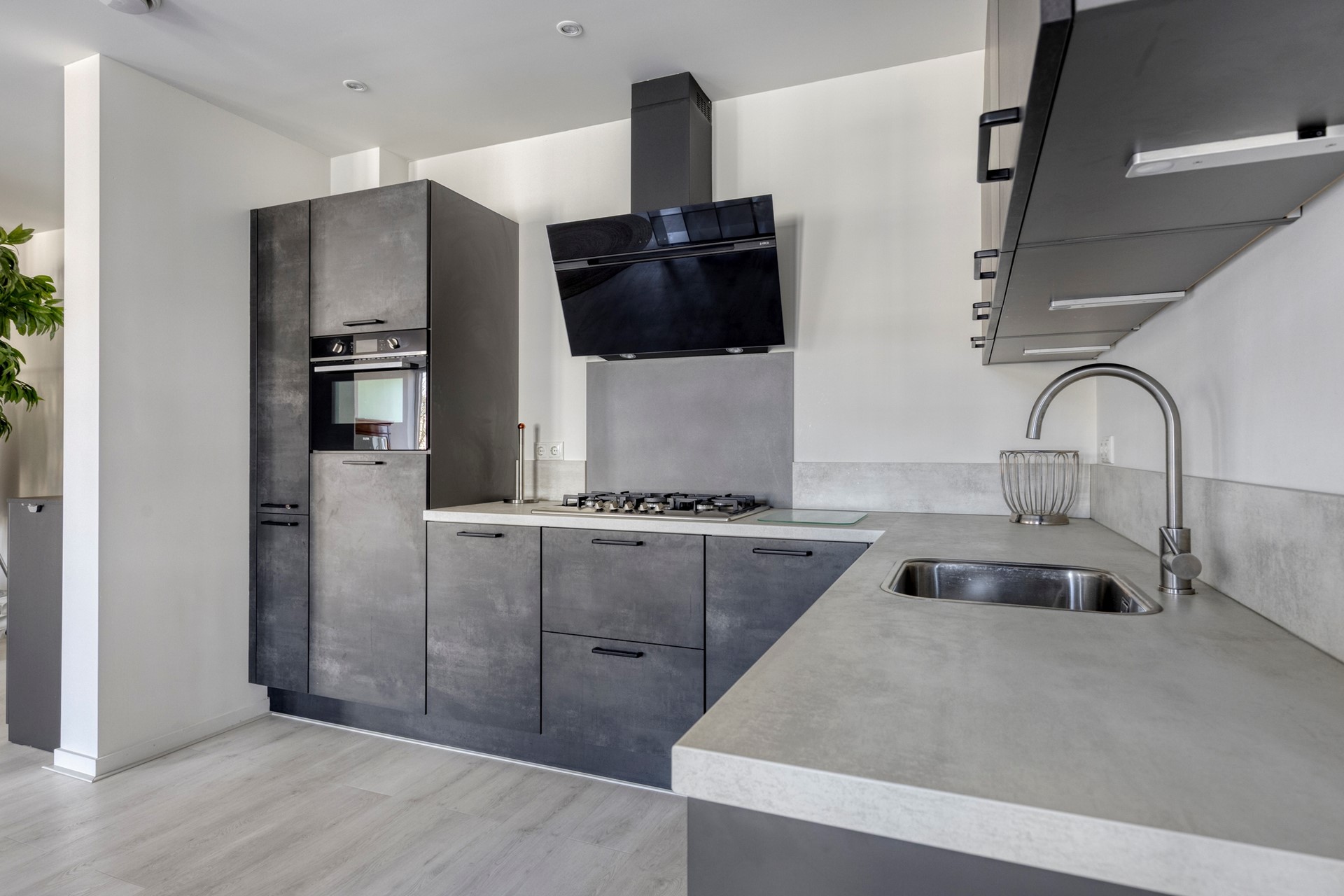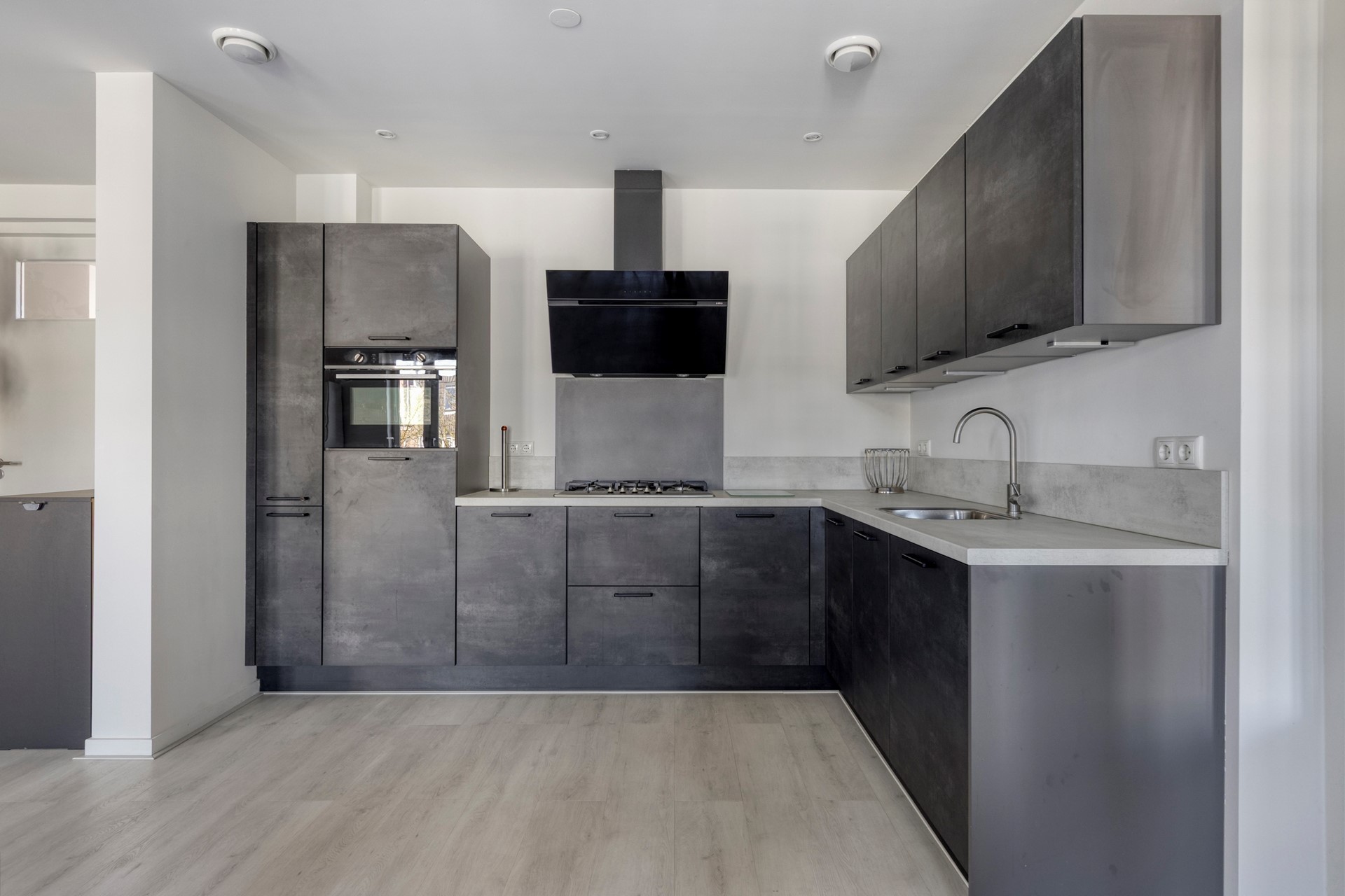 Vanuit de woonruimte/ eethoek is middels dubbele glazen deuren de 2e grote ruimte van het appartement te betreden, In deze ruimte is de modern ingerichte keuken gesitueerd. De keuken is ingericht met een modern donker antraciet L-vormig keukenblok inclusief keukenapparatuur zoals een 5-pit gaskookplaat met design-afzuigkap, koelkast, vaatwasser en combi-oven.