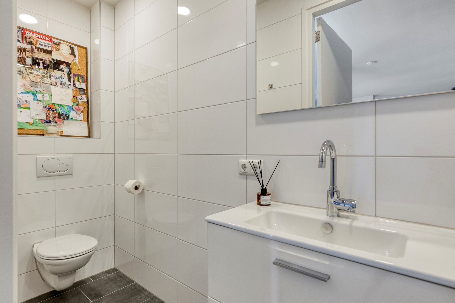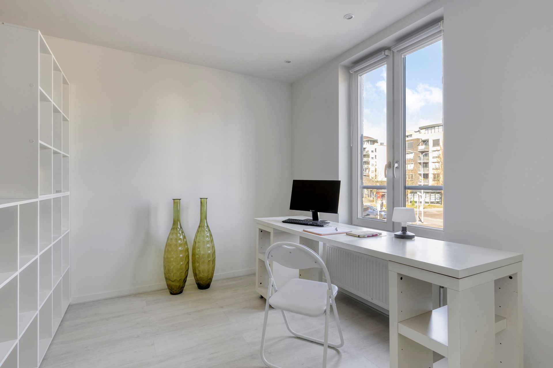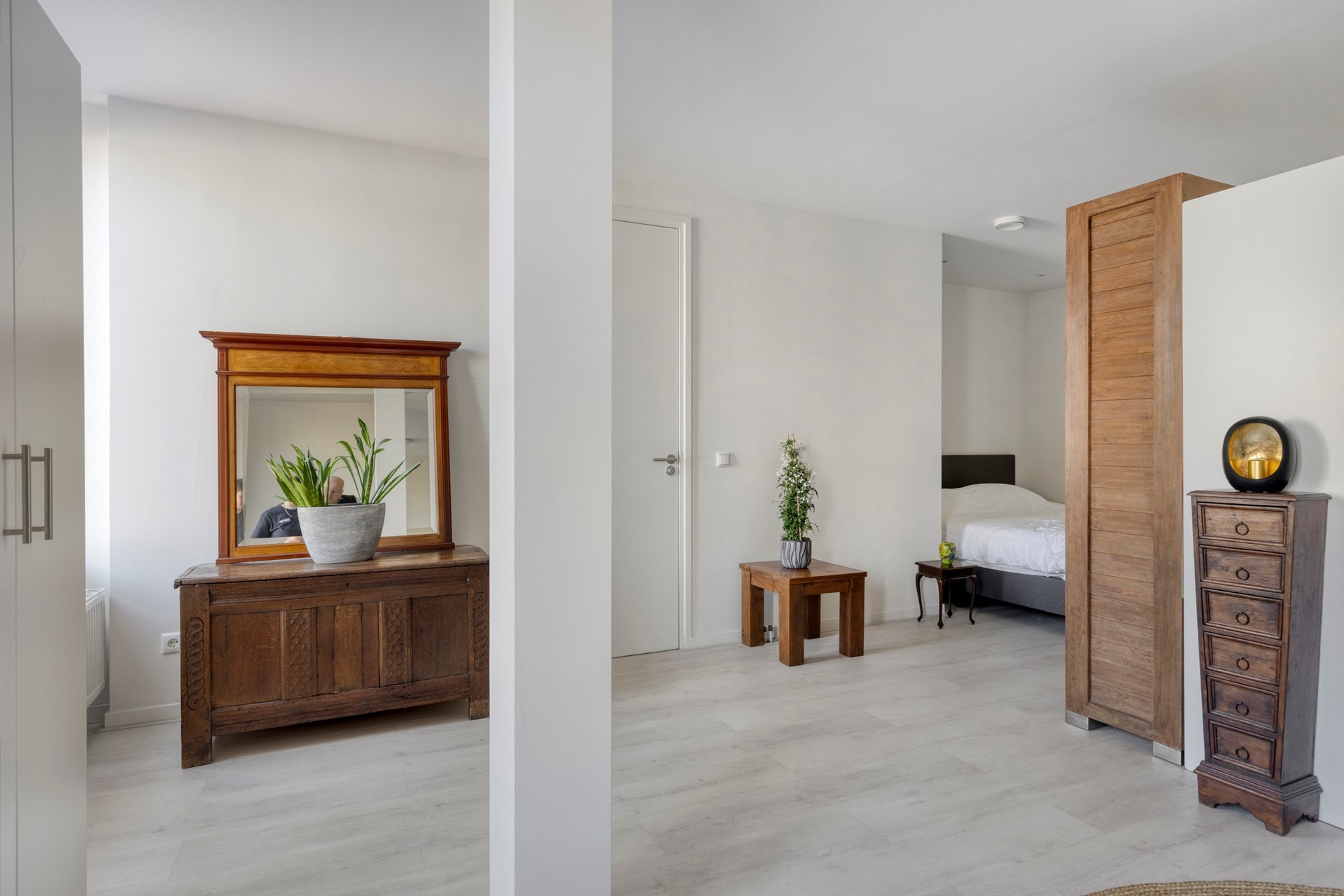 Naast deze ruime keuken is er op dit moment op een slimme modulaire wijze een ruime kantoor-/slaapruimte gecreëerd. Door de modulaire afscherming is de ruimte naar wens aan te passen en in te delen. Verder is er op eenzelfde slimme modulaire wijze een masterbedroom gecreëerd. Ook deze is naar wens aan te passen en in te delen. Via een loopdeur zijn de wc en badkamer te betreden, welke stijlvol zijn ingericht met een zwevend toilet en een doucheruimte met een thermische regendouche. Het geheel is afgewerkt met een moderne combinatie van een wastafelmeubel en stijlvolle tegels.