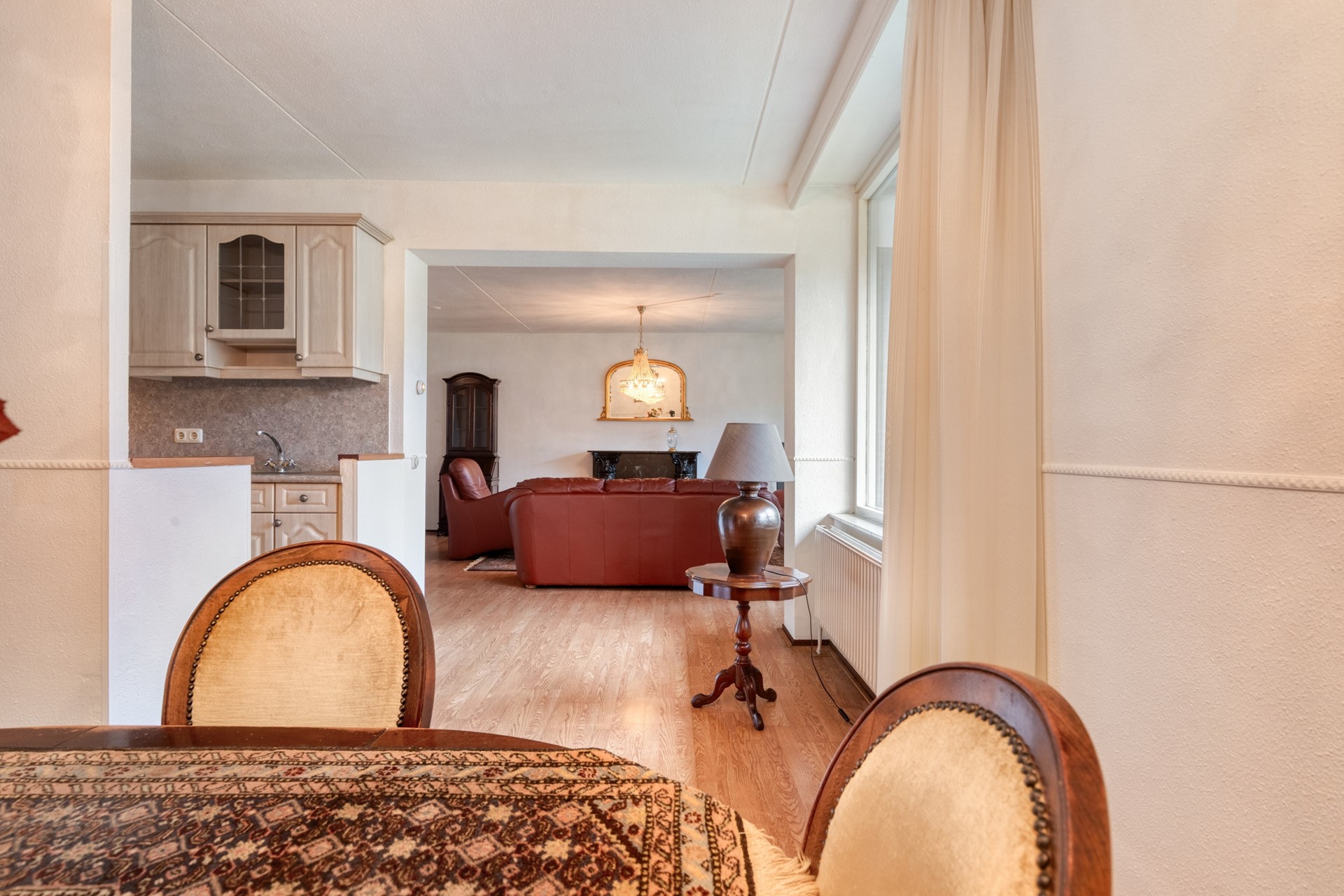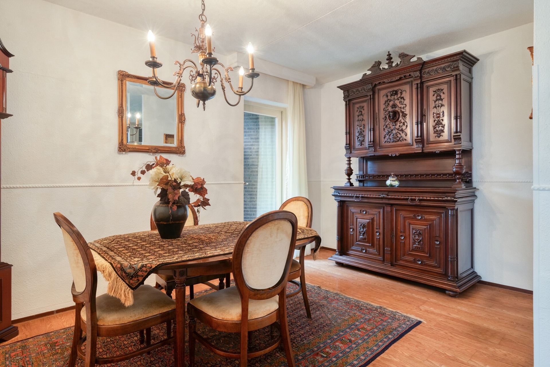 Aansluitend bevindt zich de royale eetkamer met ruimte voor een grote eettafel, waar u gezellig kunt tafelen met familie en vrienden. Vanuit de eetkamer heeft u eveneens toegang tot de zonnige achtertuin.