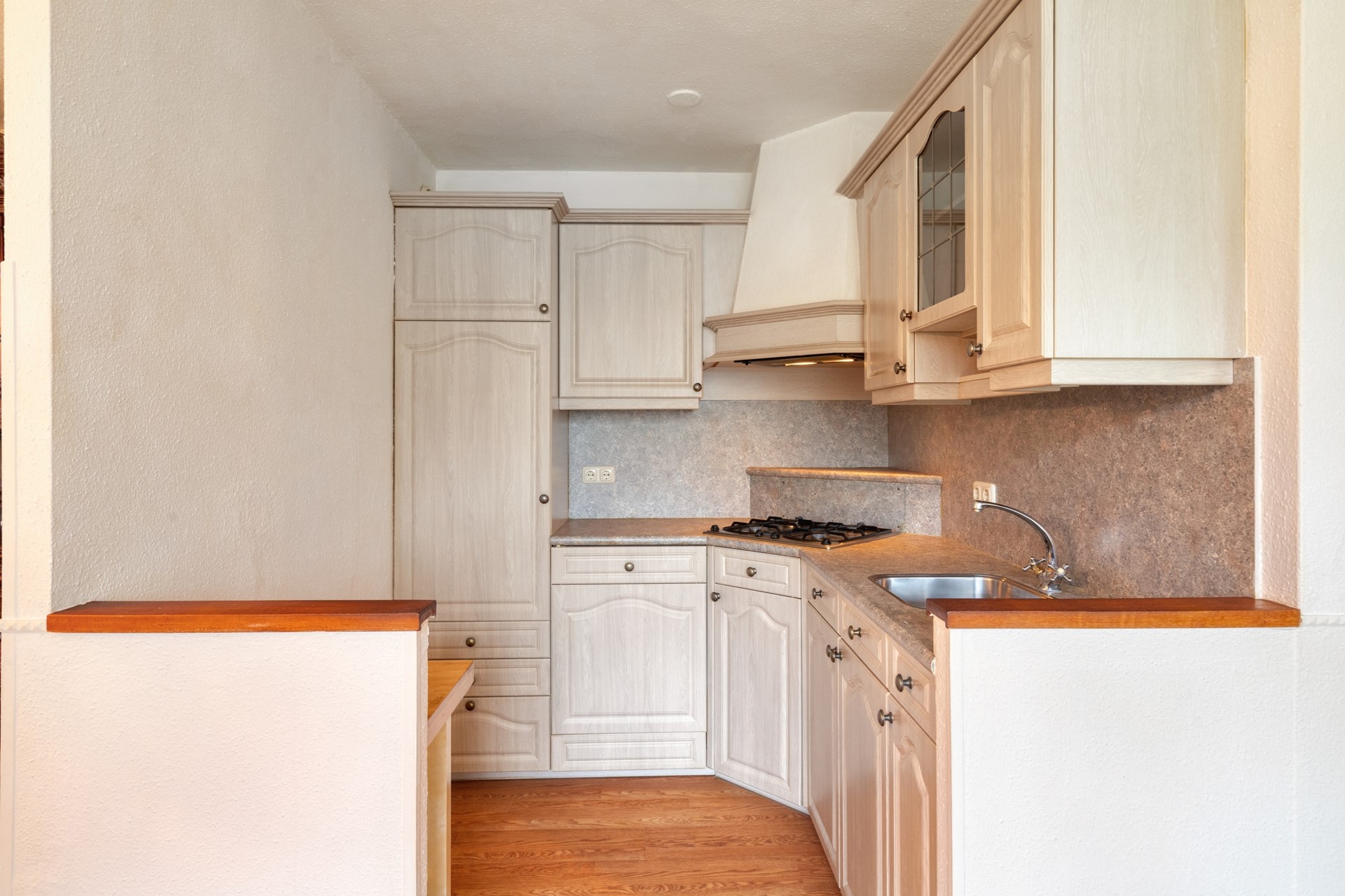 Ook de open keuken biedt een mooi uitzicht over de achtertuin en is ingericht met een net L-vormig keukenblok. U beschikt hier over volop kastruimte en diverse inbouwapparatuur, waaronder een koelkast, 4-pits gasfornuis, afzuigkap en vaatwasser.