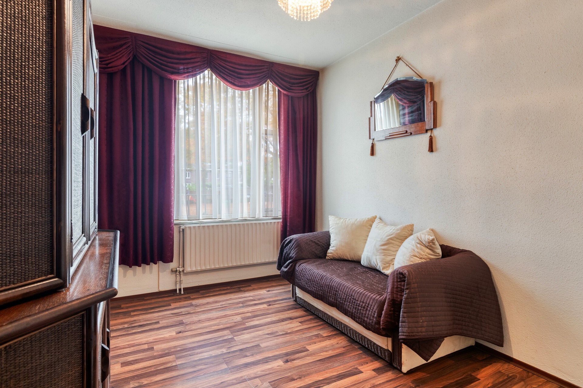 De ruime en lichte woonkamer straalt een aangename sfeer uit en biedt een gezellige zithoek. Dankzij de grote raampartijen geniet u hier van volop daglicht en het fraaie uitzicht op de achtertuin. De strakke laminaatvloer en het frisse spackspuitwerk op de wanden en het plafond zorgen voor een verzorgde en eigentijdse uitstraling. Aan de achterzijde van de woonkamer leidt een loopdeur naar het overdekte terras, dat direct aansluit op de zonnige achtertuin – een heerlijke plek om te ontspannen.